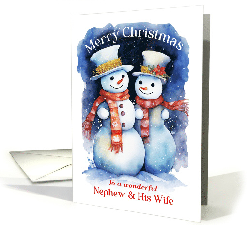 Merry Christmas to Nephew and Wife. Delightful watercolor splash painting of a happy snowman and snowwoman, wearing whimsical sparkling hats and festive scarves, with a charming snowy scene in the background.