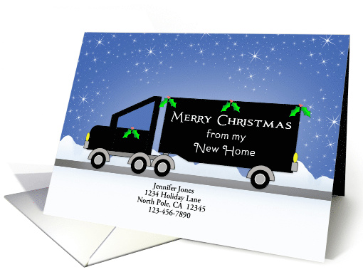 | Artist Notes: | CUSTOMIZE the front of this new address / we moved / my new address Christmas card announcement, with your name & address. Card is illustrated with a black moving truck in winter snow scene. Inner verse is customizable as well. Thank you from Sheryl Kasper Card Store |