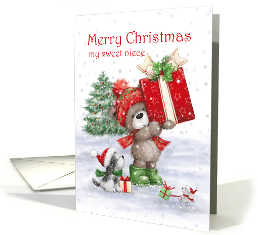 Very cute bear with red hat and scarf holding up a huge Christmas present and his friend dog and mouse around, Merry Christmas to my niece.
