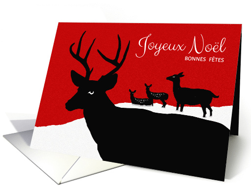 | Artist Notes: | Joyeux Noel, Bonnes Fetes, Merry Christmas and Happy Holidays written in French on the cover. Verse written in English inside. A deer family in silhouette with a buck, doe, and fawns in the snow. Send some warm wishes this holiday season with this bold and contemporary greeting card. |