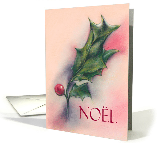| Artist Notes: | Noel is the word on this Christmas holiday card that is embellished with a simple and elegant composition of seasonal holly leaves and a berry in pastel hues of red and green and accented with dramatic black and purple shading on a pink background. |