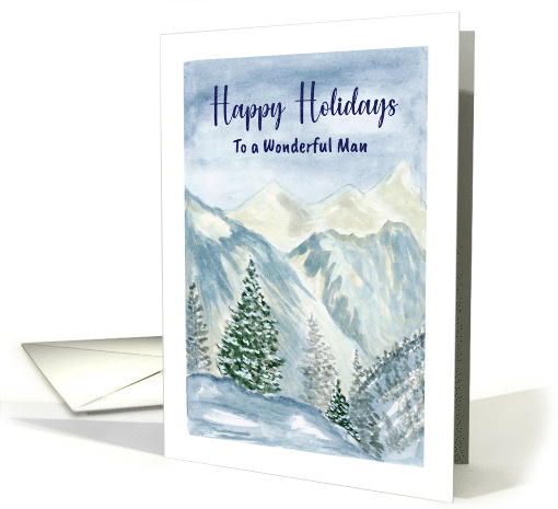 This charming greeting card, which is based on original artwork, features a lovely winter scene with mountains in the distance and evergreen trees covered with snow. Share this card with a wonderful man to wish him a joyful holiday season.