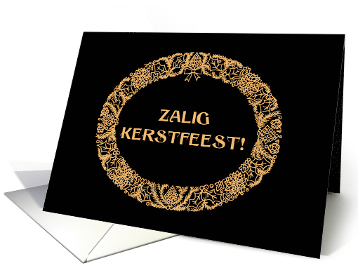 A festive Christmas Card with a Christmas wreath of holly, ivy, poinsettias, fir cones and sprigs of fir tree, This hand-drawn Christmas wreath is in gold-effect on a black background, with the Flemish Christmas greeting, 'Zalig Kerstfeest' in decorative lettering, also in gold-effect.