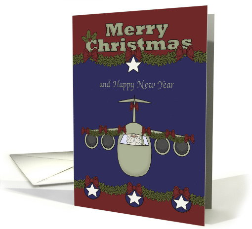 Wish anyone who is in the Air Force Merry Christmas and let him/her know how much he/she is loved and missed with a card featuring Santa Claus flying a military airplane against a dark blue sky. The background has holly decorated borders with blue ornaments, white stars and bows. Inside like all Greeting Card Universe cards can be personalized by you if you wish to give it your own personal touch. Design by Laurie Schneider, elements by Scrappin Doodles