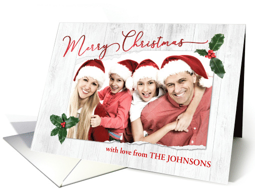 | Artist Notes: | This custom front photo card features an elegant calligraphy typography design with message, "Merry Christmas" designed with a red watercolor texture. Photo appears in digitally rendered ripped photo effect frame with holly accents on white wood background. Customize with your own message or family name. PLEASE NOTE: The ripped paper edges effect used to frame your photo is intended to look rough and uneven and is not a printing error. |