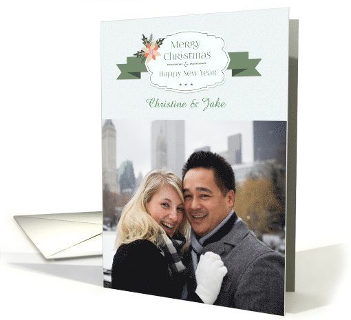 A contemporary photo card for the holidays with a decorative tag and ribbon embellished with peach colored flower and evergreen.