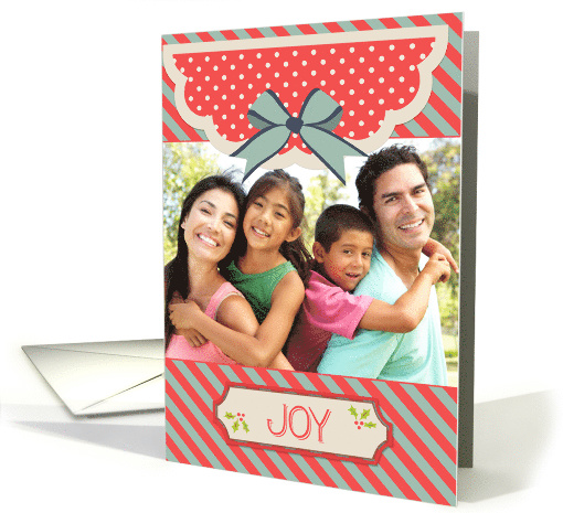 | Artist Notes: | A stylish holiday photo card with sage green and muted red stripes bordering the bottom of the card with a festive tag with holly and the word "Joy". The top repeats the striped pattern and has a scalloped edge, polka dot design with green bow. |