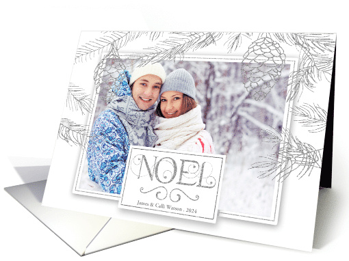 | Artist Notes: | Branches of silver pine drape around the edges of this botanical inspired holiday photo card design with a message of Noel. Such an elegant look is created with digital tools, no glitter or silver ink is used during printing. |
