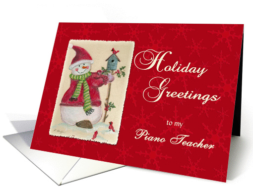 HOliday card for your piano teacher features a hand drawn snowman wearing a Santa hat and holding a bird house with cute little cardinals hopping around the snow.