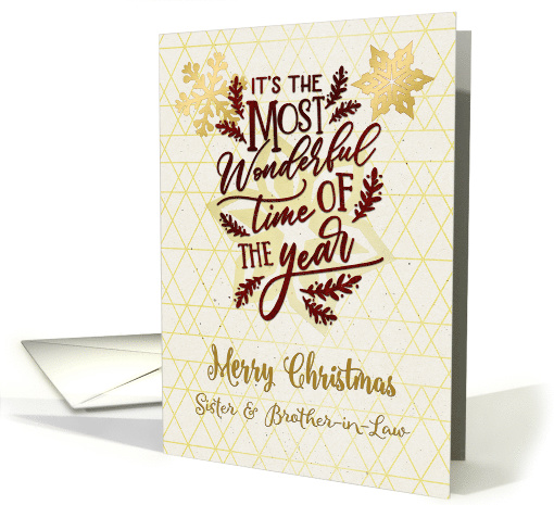 | Artist Notes: | Send sophisticated golden Merry Christmas greetings to your sister and brother-in-law with this design featuring word art saying "It's the most wonderful time of the year" with snowflakes on a modern geometric pattern background. |
