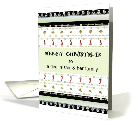 Fancy borders of bells, stars and candy canes can be found in this Christmas design for a sister and her family. The bells are in a row on a black banner. The candy canes and stars are on a white background.