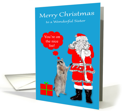 | Title: | Christmas to Sister, Raccoon with Santa Claus checking his list, blue |
