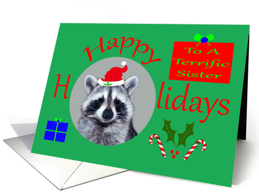 | Title: | Happy Holidays To Sister, Raccoon wearing a Santa Claus Hat with holly, presents and candy canes |