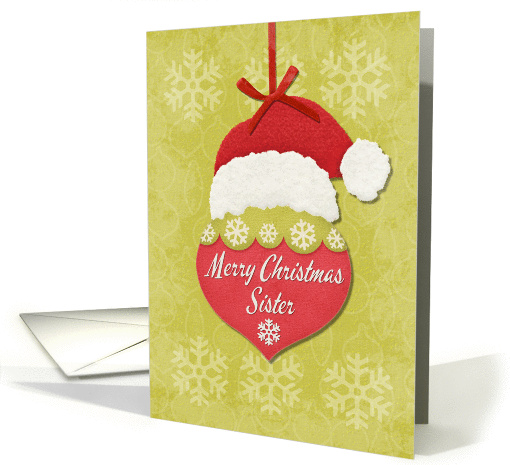 Say Merry Christmas Sister with this fun design of a digitally created puffy Santa hat sitting atop a red Christmas ornament on a green background with subtle snowflakes and ornaments. Ornament hangs from a digitally created ribbon.