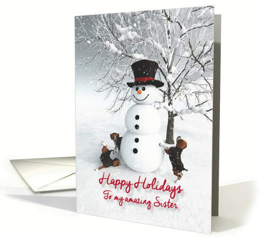 | Artist Notes: | A whimsical fantasy Happy Holidays card for your Sister. Three Beagle puppies just discovered a smiling snowman. Inside there is a text which you can customize to something very personal. |