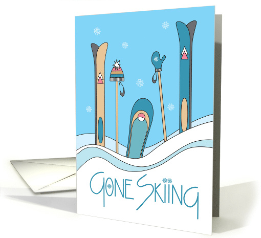 Let all of your friends and every one of your family members know where you will be spending Christmas this year with this delightfully fun skiing and snowboarding card. Hand lettered across the bottom of the card, on a big mound of white snow, are the words "Gone Skiing", decorated with tiny blue snowflakes. Sticking out of the snow above are two pair of skis, a snowboard and two ski poles. Each pole is topped with either a ski cap or a glove. White snowflakes fill the air all around. The inside wording of the card says "Holiday Greetings from the slopes!"