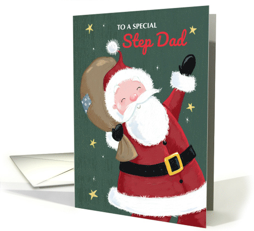 | Artist Notes: | To a Special Step Dad Christmas card illustrated with a jolly Santa Claus character, set against a dark green mottled background with yellow stars. ©DaleSimpson |