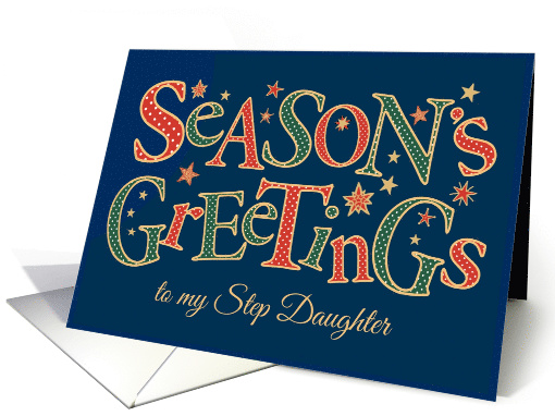 | Artist Notes: | A stylish Christmas card for a Step Daughter, with 'Season's Greetings' in red and white and dark green and white polka dot lettering, outlined in gold-effect on a deep blue background and scattered with gold-effect and red stars. You can easily change the inside message on this digital design by Judy Adamson. |