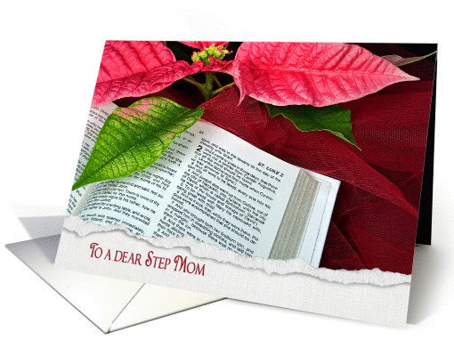 Close up of open Holy Bible with poinsettia for general Merry Christmas for step mom.
