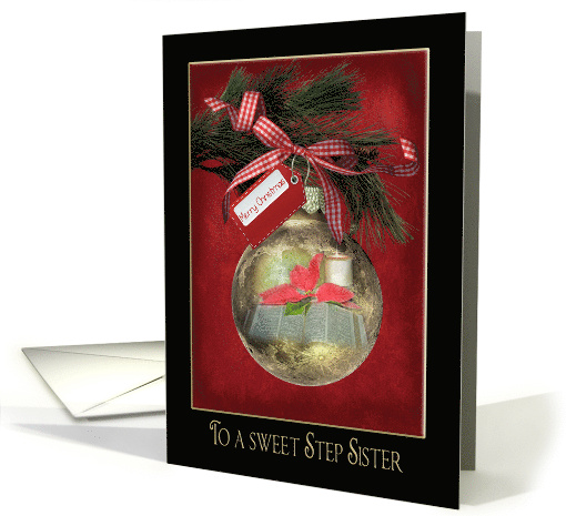 Title: | Step Sister, Christmas ornament with gingham bow and Bible |