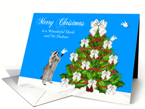 | Title: | Christmas to Uncle and Partner, Raccoon with a dove, decorated tree |