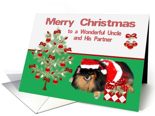 | Artist Notes: | Say Merry Christmas to a special uncle and his partner with a cute Pomeranian, Pebbles dressed as Mrs. Santa Claus with a present and Christmas tree decorated with bows, ornaments and Christmas lights on a green background with candy striped text. |