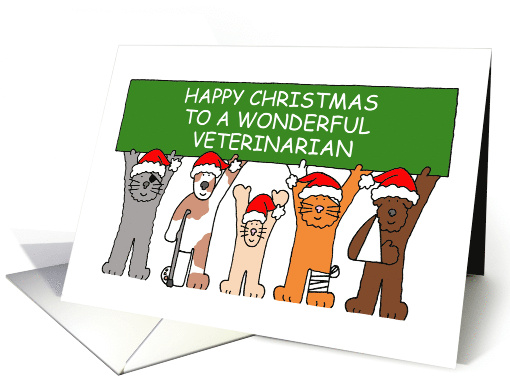 | Artist Notes: | A cartoon of five different pets with various ailments, standing up on their back paws. The animals are wearing santa hats and holding up a green colred banner that says 'Happy Christmas to a wonderful veterinarian'. |