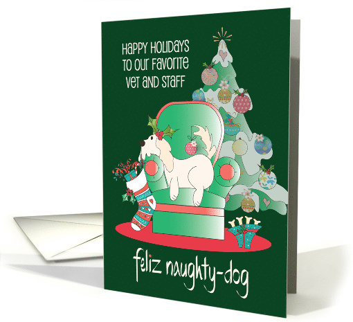 Wish your favorite veterinary office a Merry Christmas with this delightfully fun "Feliz Naughty-Dog" card. The wording is hand lettered, in white, across the bottom of the green card, with a lazy dog in a comfy green and red chair above. He holds a stocking in his mouth and an ornament dangles from his tail. Wording in the upper left corner says "Happy Holidays to our Favorite Vet and Staff". The inside wording of the card says "A little bit naughty, but oh so nice! Holiday wishes from our family and our pet dog!"