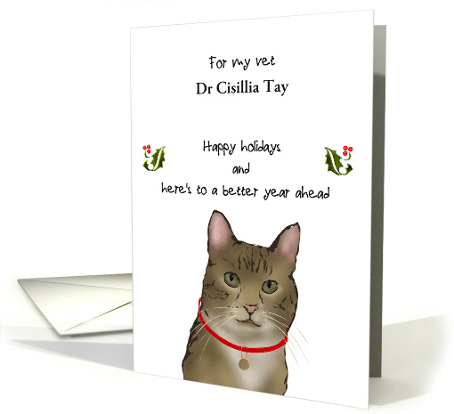 | Artist Notes: | Custom Christmas happy holidays greeting for veterinarian from cat. On both sides of the greeting sit an icon of holly berries and leaves. The cat is also requesting online consultations from home in place of visits to the vet! |
