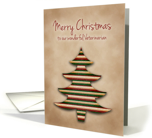 | Artist Notes: | Wish your dedicated Veterinarian a Merry Christmas with this scrapbook style card. Front of card features a Christmas tree shape with soft drop shadow to give the appearance of being cut and pasted to an aged parchment background. Tree is decorated with horizontal stripes in textured Green, Red and Yellows. Color pallet creates a warm, country feel. |