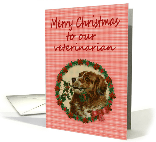 | Artist Notes: | This card is to wish your veterinarian a Merry Christmas, It has a red and white plaid background. In the center of the card is a vintage image of a Saint Bernard dog with a branch of holly in its mouth. The poinsettia decorated wreath and bow make it more festive. You can edit the inside text. The original vintage image of the dog is from The Graphics Fairy. |