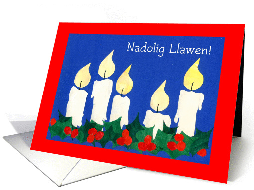 A Welsh Christmas card with a row of five white candles and some holly on a blue background, from a handpainted paper collage design by Judy Adamson. The inside is left blank for your own message.