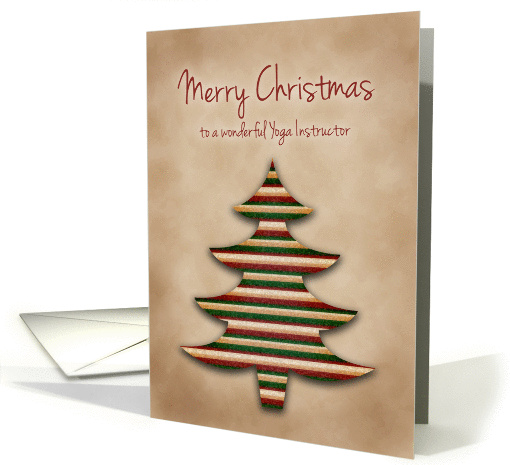 | Artist Notes: | Wish your dedicated Yoga Instructor a Merry Christmas with this scrapbook style card. Front of card features a Christmas tree shape with soft drop shadow to give the appearance of being cut and pasted to an aged parchment background. Tree is decorated with horizontal stripes in textured Green, Red and Yellows. Color pallet creates a warm, country feel. |