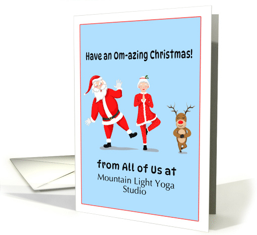 | Artist Notes: | Send this lighthearted card to your yoga clients—featuring Santa Claus struggling with mountain pose while Mrs. Claus and the reindeer strike it perfectly. A fun illustration your clients are sure to enjoy! |