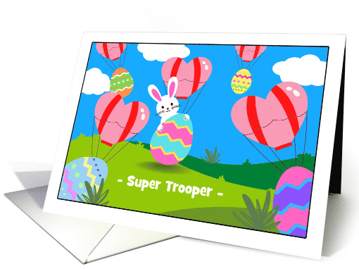 Artist Notes: | Easter eggs falling from the sky by way of brightly colored heart hot air balloons decorate the cover of this Easter card for a military paratrooper. A cute white bunny has also hitched a ride from the sky. Cute colorful modern design with custom front text. |
