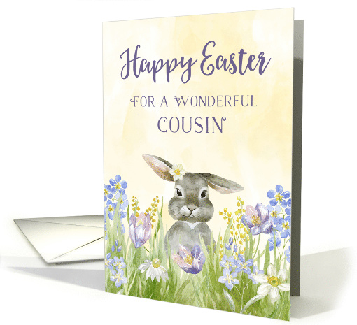 A cute happy Easter card for your cousin with adorable illustrations of a Easter bunny in a spring garden.