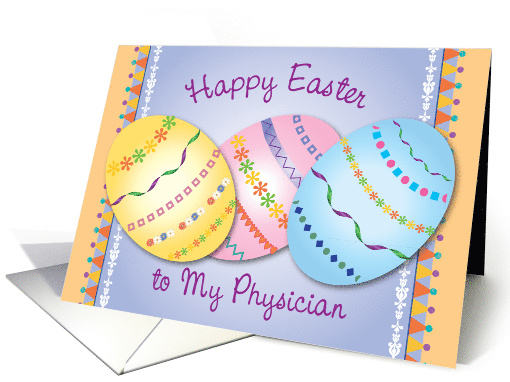 | Artist Notes: | Send this colorful Easter card to your physician, featuring 3 decorated eggs, pastel background, and colorful borders. You can change the inside message at checkout, if you wish. ©Gail Pepin |