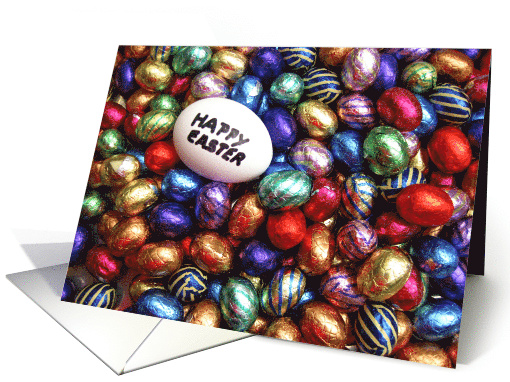 Created from an original Studio Porto Sabbia photo. A pile of chocolate Easter eggs in various colors of foil whis the recipient of this card a very happy Easter