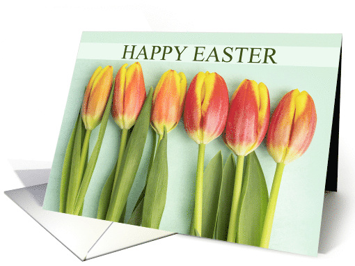 Six red and yellow tulips in a row photographed on a light spring green color is a lovely way to wish anyone a Happy Easter.