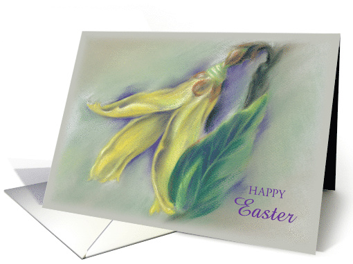 Wish the recipient happy Easter with this card that is embellished with a single flower of the forsythia shrub along with foliage in pastel colors of yellow, green and purple. This blossom is one of the first to appear in springtime and makes a lovely symbol of renewal.