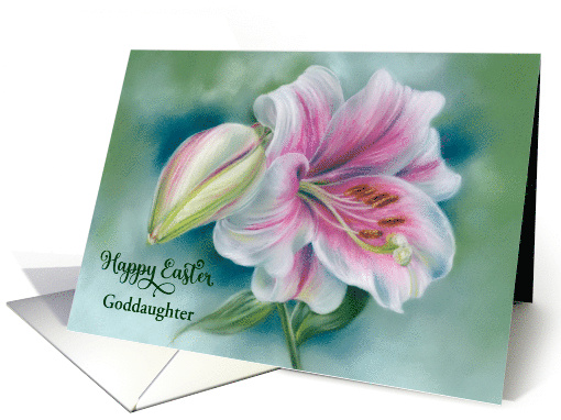 | Artist Notes: | Your goddaughter is sure to love the sweet pink and white lily accompanied by an unopened bud on a backdrop of green rendered in soft pastels on the cover of this Easter greeting card. The recipient text may be customized easily. |