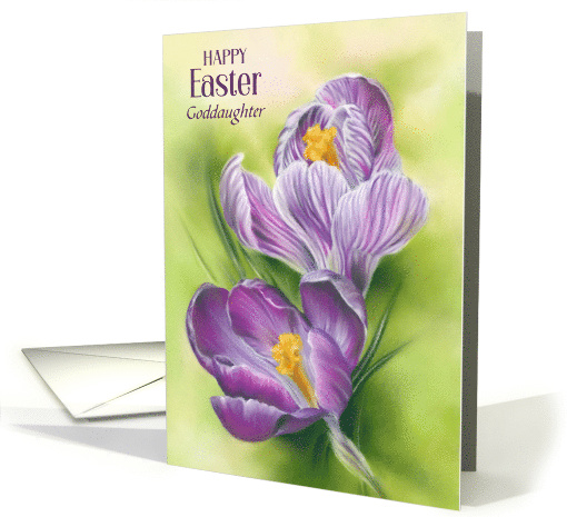 | Artist Notes: | Personalize this card to send an Easter greeting toy your beloved goddaughter or to any recipient. Exquisite purple crocus flowers set against a background of lively green created in soft pastel colors are featured on the front. |