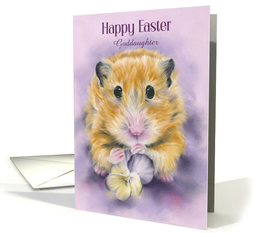 | Artist Notes: | A fetching little hamster with golden yellow fur and a gleam in its eyes poses with a yellow and purple pansy blossom in its tiny pink paws in the soft pastel animal art that adorns the cover of this Easter greeting along with text that may be personalized for your goddaughter or for anyone. |