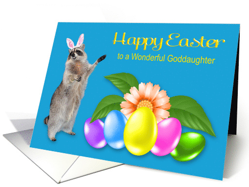 | Title: | Easter to Goddaughter, Raccoon with bunny ears, flower, eggs, blue |
