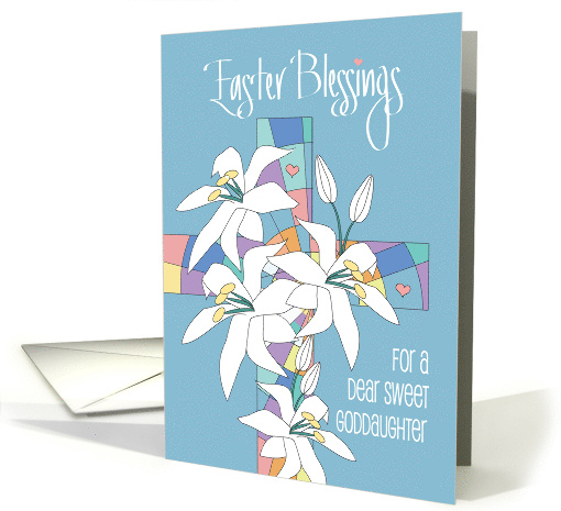 Your goddaughter will love this beautiful Easter card, with its magnificent Easter cross that is filled with all sorts of springtime colors of lavender, blue, pink, orange and yellow. The colors fill the blue card, behind a gathering of white Easter lilies that decorate the shaft of the cross with beautiful blooming flowers. Tiny pink hearts of love for your special goddaughter brighten parts of the cross, with elegantly lovely white hand lettered wording, across the card's top, that says "Easter Blessings". Tucked into the bottom right corner are the words "For a dear sweet Goddaughter". The inside wording of the card says "Wishing a goddaughter, who holds a special place in our hearts, a blessed Easter."