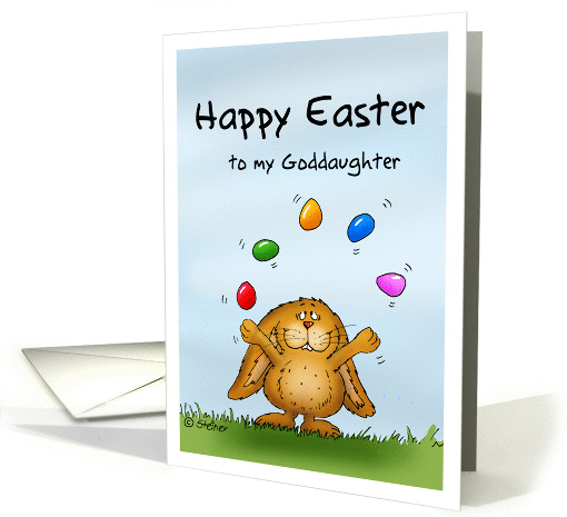 | Artist Notes: | This card is a fun and humorous way to send Happy Easter Greetings to your Goddaughter. In this design I sketched a cute little bunny who is juggling with several colored eggs. I hope you enjoy the design for your Goddaughter. Happy Easter! |