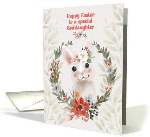 | Artist Notes: | Say Happy Easter to your Goddaughter with this design featuring an adorable white bunny wearing a crown of flowers with the sweetest expression on it's face. The bunny is inside a wreath of leaves and flowers on a background with a subtle leaf design. |