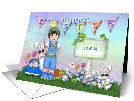 | Artist Notes: | A colorful banner that reads Happy Easter in the background. A sign that reads Godson Perched on top of the sign is a cute green frog and a little inchworm. An adorable little boy with a frog in his pocket. A sweet little white bunny is peering out from behind the boy. The other white bunny peers from behind the blue bells. The inside message reads: " May your Easter be as sweet as you! XXOO " Inside message may be changed by you. |