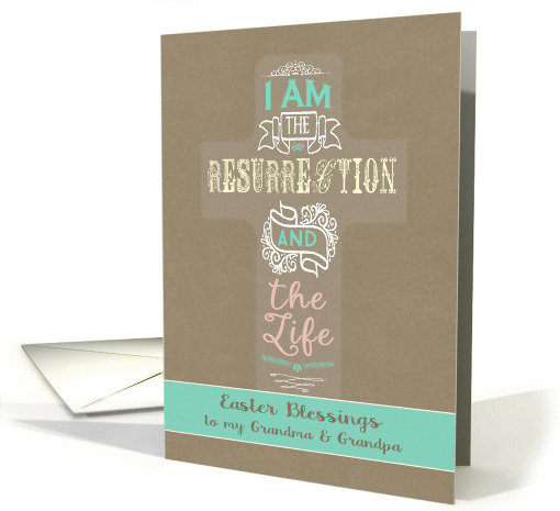 Send Easter Blessings to your Grandma and Grandpa with this modern Card featuring a cross filled with word-art, the bible verse "I am the resurrection and the Life". Colors are soft pastel spring colors: mint, yellow, white and peach. A Kraft paper effect background gives this card a handmade touch.