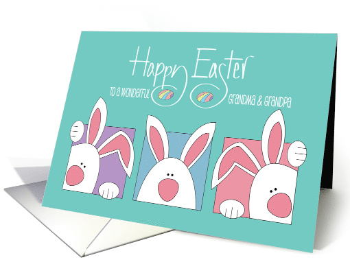 This adorable Easter card and its three white bunnies will really be enjoyed by your Grandma and Grandpa for Easter this year. They will see that the little white bunnies are trying to hide as they eye the hidden Easter eggs above them, in the hand lettered wording of "Happy Easter". Their long bunny ears give them away as they explode outward from their heads to pink and white points. Also written on the card, above the delightful bunnies, is the wording "To a wonderful Grandma & Grandpa". The card's inside wording joyfully says "Happy Easter, with love, from some-bunny who loves you!"